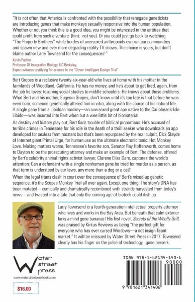 Bert Gropes is a reclusive 26 year-old who lives at home with his mother in the farmlands of Woodland, California. He has no money, and he's about to get fired, again, from the job he loves: teaching social studies to middle schoolers. He knows about those problems. What Bert and his mother, Eugenia Gropes, don't know until it's too late is that before he was even born, someone genetically altered him in vitro, along with the course of his natural life. A single gene from a Libidoan monkey-an oversexed great ape native to the Caribbean's Isle Libido-was inserted into Bert when but a wee little bit of biomaterial. As destiny and history play out, Bert finds trouble of biblical proportions. He's accused of terrible crimes in Tennessee for his role in the death of a thrill seeker who downloads an app developed for sexless farm roosters but that's been repurposed by the real culprit, Dick Slayde of Internet giant Primal Urge, for human use as the ultimate electronic tonic: Hot Monkey Love. Making matters worse, Tennessee's favorite son, Senator Ray Hoffenworth, comes home to Dayton to be the prosecuting attorney and make an example of Bert. The defense, offered by Bert's celebrity animal rights activist lawyer, Clarene Eliza Dare, captures the world's attention: Can a defendant with a single nonhuman gene be tried for murder as a person, as that term is understood by our laws, any more than a dog or a cat? When the legal titans clash in court over the consequence of Bert's mixed-up genetic sequence, it's the Scopes Monkey Trial all over again. Except one thing: The story's DNA has been mutated-comically and dramatically recombined with strands harvested from today's news-and twisted into a tale that only the coming age of biotech could dish up.