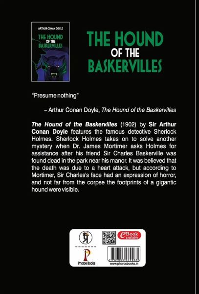 "Presume nothing" ― Arthur Conan Doyle, The Hound of the Baskervilles The Hound of the Baskervilles (1902) by Sir Arthur Conan Doyle features the famous detective Sherlock Holmes. Sherlock Holmes takes on to solve another mystery when Dr. James Mortimer asks Holmes for assistance after his friend Sir Charles Baskerville was found dead in the park near his manor. It was believed that the death was due to a heart attack, but according to Mortimer, Sir Charles's face had an expression of horror, and not far from the corpse the footprints of a gigantic hound were visible.