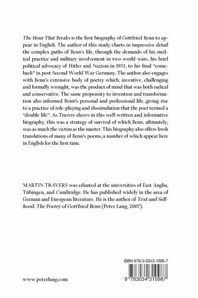 The Hour That Breaks is the first biography of Gottfried Benn to appear in English. The author of this study charts in impressive detail the complex paths of Benn's life, through the demands of his medical practice and military involvement in two world wars, his brief political advocacy of Hitler and Nazism in 1933, to his final «comeback» in post Second World War Germany. The author also engages with Benn's extensive body of poetry which, inventive, challenging and formally wrought, was the product of mind that was both radical and conservative. The same propensity to invention and transformation also informed Benn's personal and professional life, giving rise to a practice of role-playing and dissimulation that the poet termed a «double life». As Travers shows in this well-written and informative biography, this was a strategy of survival of which Benn, ultimately, was as much the victim as the master. This biography also offers fresh translations of many of Benn's poems, a number of which appear here in English for the first time.