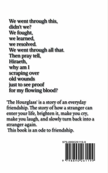 'The Hourglass' is a story of an everyday friendship. The story of how a stranger can enter your life, brighten it, make you cry, make you laugh, and slowly turn back into a stranger again. This book is an ode to friendship. It's the story of how two people meet, fight, reconcile, grow, and miss each other years along the way. The book is divided into the aforesaid five chapters. There are too many books about romantic heartbreak, but not enough about the heartbreak that you go through when you lose a friend. This book is for all those friendships.