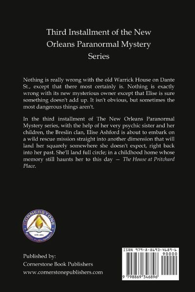 Nothing is really wrong with the old Warrick House on Dante St., except that there most certainly is. Nothing is exactly wrong with its new mysterious owner except that Elise is sure something doesn't add up. It isn't obvious, but sometimes the most dangerous things aren't. In the third installment of The New Orleans Paranormal Mystery series, with the help of her very psychic sister and her children, the Breslin clan, Elise Ashford is about to embark on a wild rescue mission straight into another dimension that will land her squarely somewhere she doesn't expect, right back into her past. She'll land full circle; in a childhood home whose memory still haunts her to this day - The House at Pritchard Place.