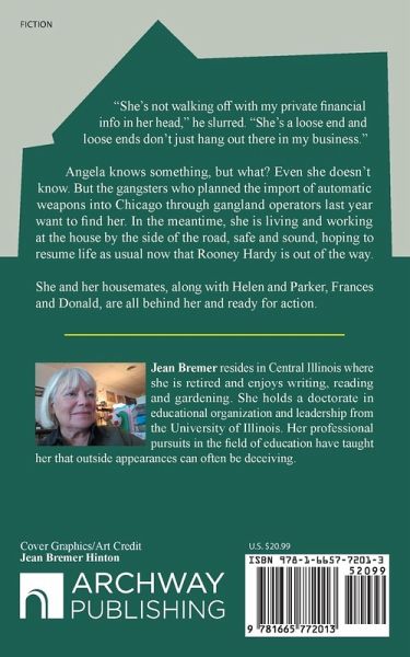 "She's not walking off with my private financial info in her head," he slurred. "She's a loose end and loose ends don't just hang out there in my business." Angela knows something, but what? Even she doesn't know. But the gangsters who planned the import of automatic weapons into Chicago through gangland operators last year want to find her. In the meantime, she is living and working at the house by the side of the road, safe and sound, hoping to resume life as usual now that Rooney Hardy is out of the way. She and her housemates, along with Helen and Parker, Frances and Donald, are all behind her and ready for action.