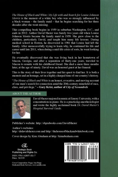 The House of Black and White: My Life with and Search for Louise Johnson Morris is the memoir of a white boy who was so strongly influenced by a black woman - the family maid - that he begins searching for her three decades after she went missing. This compelling book begins in 1959 in suburban Washington, D.C., and ends in 2012. Author David Sherer was barely two years old when Louise Johnson Morris became the family maid in 1959. She grew close to the children, particularly David, and taught him many life lessons. During medical school in Boston, he discovered in 1981 that Louise had left the family. After unsuccessfully trying to learn why, he continued his life and career until late 2011, when during a mid-life crisis of sorts, he went looking for her. He eventually discovered that she was living back in her hometown of Macon, Georgia, and after a separation of thirty-one years, traveled to Macon to reunite with his childhood friend. She died a mere three months later, at the age of ninety. David was an honored guest at her funeral. This is the story of their lives together and his quest to find her. It is both a memoir and an homage, set in a highly charged time of our country's history. "The House of Black and White is an honest, evocative, and moving account of one man's search for connection amid the 20th-century minefield of race, class, and privilege." - Gary Krist, author of City of Scoundrels About the Author David Sherer majored in music at Emory University, with a concentration in piano. He is a practicing anesthesiologist and wrote the highly acclaimed book Dr. David Sherer's Hospital Survival Guide. Publisher's website: http://sbprabooks.com/DavidSherer Author's websites: http://drdavidsherer.com and http://thehouseofblackandwhitebook.com Cover design by Kim Abraham at http://kimabraham.com