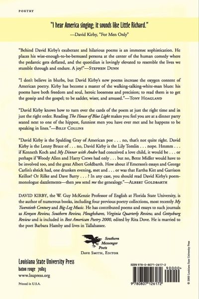The House of Blue Light is the second collection of autobiographical ""memory poems"" by Catholic-school-boy-gone-bad-turned-poet-made-good David Kirby, a stand-up comic of verse if ever there was one: ""in Stardust Memories . . . these wise space aliens who visit Earth . . . tell [Woody Allen] that if he really wants to serve humanity, / he should tell funnier jokes, wait, that's my duty, / I think, that's my public duty! Because sooner or later, / we all turn upside down."" Wearing both heart and wit on his sleeve, Kirby confides in longish narrative poems events he actually or vicariously experienced, as a child, a teen, a young man, and now, as well as some future scenes he imagines. Literary theorists Jacques Derrida and Roland Barthes; Little Richard and Muhammad Ali; Herman Melville, James Dickey, and Henry James; friends, family, personal heroes, and acquaintances, including the Ah Oui Girl of Paris and Tige Watley's Whoah of Baton Rouge, are all equally alive in Kirby's poems. As Walt Whitman did, Kirby offers a first-person speaker as a proxy for everyone else (""Who, including ourselves, / knows what we know and when we know it?""), achieving a unity and accessible authenticity rare in poetry. A fun house, ""a mishmash for sure,"" The House of Blue Light is a delightfully entertaining, irreverent, erudite collection of commentary piling upon commentary that brings us ""that one element so largely absent / from our quotidian existence, i.e., surprise.