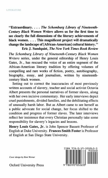Setting out to correct the inadequacies of many written accounts of slavery, teacher and social activist Octavia Albert added her own incisive commentary to the personal narratives of former slaves. Her early interviews, like many antebellum slave narratives, depict cruel punishments, divided families, and debilitating labour. Seeing herself as a public advocate for social change, Albert called for every Christian's personal acceptance of responsibility for slavery's legacies and lessons. As well as its historical value, the book has many merits as a work of literature, using dialogue and experiments with dialect, and incorporating songs and poems in the text.