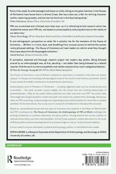 The House of Commons is one of Britain's mysterious institutions: constantly in the news yet always opaque. In this ground-breaking anthropological study of the worldâ s most famous parliament, Emma Crewe reveals the hidden mechanisms of parliamentary democracy.