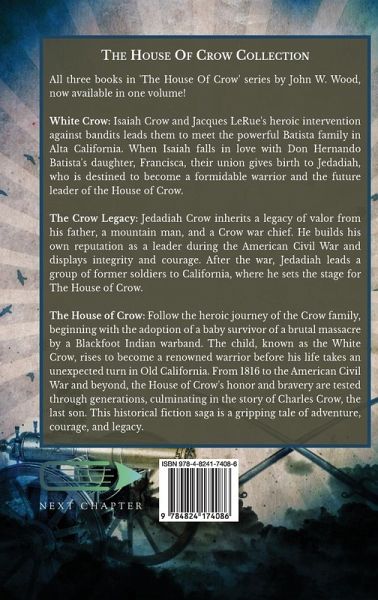 All three books in 'The House Of Crow' series by John W. Wood, now available in one volume! White Crow: Isaiah Crow and Jacques LeRue's heroic intervention against bandits leads them to meet the powerful Batista family in Alta California. When Isaiah falls in love with Don Hernando Batista's daughter, Francisca, their union gives birth to Jedadiah, who is destined to become a formidable warrior and the future leader of the House of Crow. The Crow Legacy: Jedadiah Crow inherits a legacy of valor from his father, a mountain man, and a Crow war chief. He builds his own reputation as a leader during the American Civil War and displays integrity and courage. After the war, Jedadiah leads a group of former soldiers to California, where he sets the stage for The House of Crow. The House of Crow: Follow the heroic journey of the Crow family, beginning with the adoption of a baby survivor of a brutal massacre by a Blackfoot Indian warband. The child, known as the White Crow, rises to become a renowned warrior before his life takes an unexpected turn in Old California. From 1816 to the American Civil War and beyond, the House of Crow's honor and bravery are tested through generations, culminating in the story of Charles Crow, the last son. This historical fiction saga is a gripping tale of adventure, courage, and legacy.