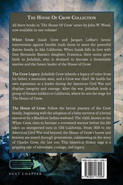 All three books in 'The House Of Crow' series by John W. Wood, now available in one volume! White Crow: Isaiah Crow and Jacques LeRue's heroic intervention against bandits leads them to meet the powerful Batista family in Alta California. When Isaiah falls in love with Don Hernando Batista's daughter, Francisca, their union gives birth to Jedadiah, who is destined to become a formidable warrior and the future leader of the House of Crow. The Crow Legacy: Jedadiah Crow inherits a legacy of valor from his father, a mountain man, and a Crow war chief. He builds his own reputation as a leader during the American Civil War and displays integrity and courage. After the war, Jedadiah leads a group of former soldiers to California, where he sets the stage for The House of Crow. The House of Crow: Follow the heroic journey of the Crow family, beginning with the adoption of a baby survivor of a brutal massacre by a Blackfoot Indian warband. The child, known as the White Crow, rises to become a renowned warrior before his life takes an unexpected turn in Old California. From 1816 to the American Civil War and beyond, the House of Crow's honor and bravery are tested through generations, culminating in the story of Charles Crow, the last son. This historical fiction saga is a gripping tale of adventure, courage, and legacy.