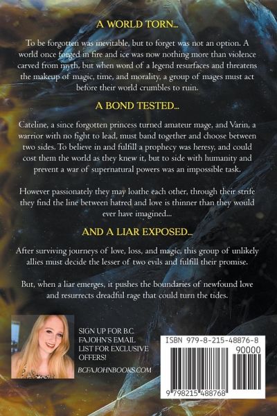A WORLD TORN... To be forgotten was inevitable, but to forget was not an option. A world once forged in fire and ice was now nothing more than violence carved from myth, but when a legend resurfaces and threatens the makeup of magic, time, and morality, a group of mages must act before their world crumbles to ruin. A BOND TESTED... Cateline, a since forgotten princess turned amateur mage, and Varin, a warrior with no fight to lead, must band together and choose between two sides. To believe in and fulfill a prophecy was heresy, and could cost them the world as they knew it, but to side with humanity and prevent a war of supernatural powers was an impossible task. However passionately they may loathe each other, through their strife they find the line between hatred and love is thinner than they would have ever imagined. AND A LIAR EXPOSED... After surviving journeys of love, loss, and agony, this group of unlikely allies must decide the lesser of two evils and fulfill their promise. But, when a liar emerges, it pushes the boundaries of newfound love and resurrects dreadful rage that could turn the tides.