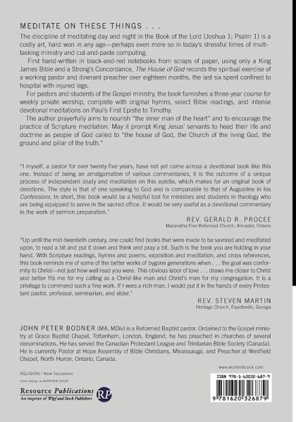 Meditate on these things . . . The discipline of meditating day and night in the Book of the Lord (Joshua 1; Psalm 1) is a costly art, hard won in any age--perhaps even more so in today's stressful times of multi-tasking ministry and cut-and-paste computing. First hand-written in black-and-red notebooks from scraps of paper, using only a King James Bible and a Strong's Concordance, The House of God records the spiritual exercise of a working pastor and itinerant preacher over eighteen months, the last six spent confined to hospital with injured legs. For pastors and students of the Gospel ministry, the book furnishes a three-year course for weekly private worship, complete with original hymns, select Bible readings, and intense devotional meditations on Paul's First Epistle to Timothy. The author prayerfully aims to nourish ""the inner man of the heart"" and to encourage the practice of Scripture meditation. May it prompt King Jesus' servants to heed their life and doctrine as people of God called to ""the house of God, the Church of the living God, the ground and pillar of the truth.""