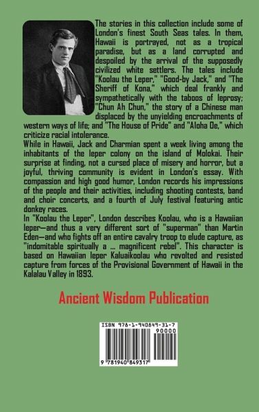 The stories in this collection include some of London's finest South Seas tales. In them, Hawaii is portrayed, not as a tropical paradise, but as a land corrupted and despoiled by the arrival of the supposedly civilized white settlers. The tales include "Koolau the Leper," "Good-by Jack," and "The Sheriff of Kona," which deal frankly and sympathetically with the taboos of leprosy; "Chun Ah Chun," the story of a Chinese man displaced by the unyielding encroachments of western ways of life; and "The House of Pride" and "Aloha Oe," which criticize racial intolerance. While in Hawaii, Jack and Charmian spent a week living among the inhabitants of the leper colony on the island of Molokai. Their surprise at finding, not a cursed place of misery and horror, but a joyful, thriving community is evident in London's essay. With compassion and high good humor, London records his impressions of the people and their activities, including shooting contests, band and choir concerts, and a fourth of July festival featuring antic donkey races. In "Koolau the Leper", London describes Koolau, who is a Hawaiian leper-and thus a very different sort of "superman" than Martin Eden-and who fights off an entire cavalry troop to elude capture, as "indomitable spiritually a ... magnificent rebel". This character is based on Hawaiian leper Kaluaikoolau who revolted and resisted capture from forces of the Provisional Government of Hawaii in the Kalalau Valley in 1893.