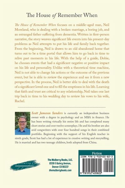 The House of Remember When focuses on a middle-aged man, Neil Moreland, who is dealing with a broken marriage, a boring job, and an estranged father suffering from dementia. Written in first-person narrative, the story weaves significant life events into his present-day problems as Neil attempts to put his life and family back together. From the beginning, Neil is drawn to an old abandoned home that turns out to be a time portal that allows him to go back in time to relive past moments in his life. With the help of a guide, Dobie, he chooses events that had a significant negative or positive impact on his life and personality. Unlike with a theoretical time machine, Neil is not able to change his actions or the outcome of the previous event, but he is able to review the experience and see it from a new perspective. In the process, Neil is better able to deal with the death of a significant loved one and to ll the emptiness in his life. Learning that faith and trust are critical to any relationship, Neil takes one last trip back in time to his wedding day to review his vows to his wife, Rachel.