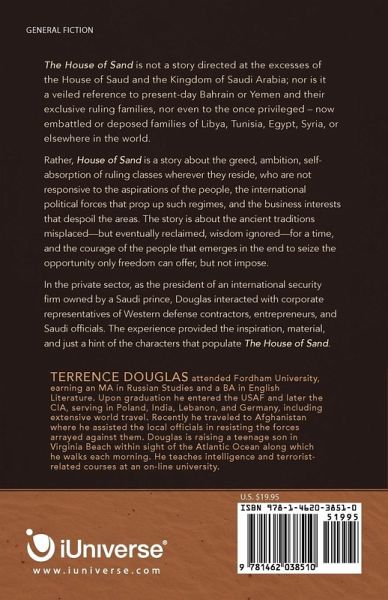 The House of Sand is not a story directed at the excesses of the House of Saud and the Kingdom of Saudi Arabia; nor is it a veiled reference to present-day Bahrain or Yemen and their exclusive ruling families, nor even to the once privileged - now embattled or deposed families of Libya, Tunisia, Egypt, Syria, or elsewhere in the world. Rather, The House of Sand is a story about the greed, ambition, self-absorption of ruling classes wherever they reside, who are not responsive to the aspirations of the people, the international political forces that prop up such regimes, and the business interests that despoil the areas. The story is about the ancient traditions misplaced-but eventually reclaimed, wisdom ignored-for a time, and the courage of the people that emerges in the end to seize the opportunity only freedom can offer, but not impose. Author Terrence Douglas has observed the excesses and endemic corruption throughout the world in the course of his travels, always marveling how wisdom and courage stir just below the surface until the appropriate time when it reappears in the soul of the people. Follow the journey across the desert from the perspective of Aziz, who embodies an ancient wisdom and integrity; his son, Sultan, who wields power only to satisfy his personal and exorbitant tastes and foibles; and Chester Holycross, so desperate to reclaim his business reputation, who is willing to stoop to satisfy Sultan's every whim. The supporting cast of characters offers the contrast and relief-sometimes comic- that the story requires.