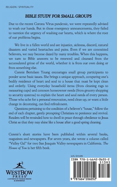 BIBLE STUDY FOR SMALL GROUPS Due to the recent Corona Virus pandemic, we were repeatedly advised to wash our hands. But in those emergency announcements, they failed to mention the urgency of washing our hearts, which is where the root of our problems begins. We live in a fallen world and see injustice, sickness, discord, natural disasters and varied heartaches and pains. Even if we are committed believers, we may become dazed by many troubles. When this happens, we turn to Bible answers to be renewed and cleansed from the accumulated grime of the world, whether it is from our own doing or from something else. Connie Bertelsen Young encourages small group participants to ponder some basic issues. She brings a unique approach, comparing one's bodily residence of heart and soul to a house that must be kept clean and orderly. Using everyday household items (from cleaning rags to measuring cups) and common homeowner needs (from grocery shopping to security systems) to explain the heart and soul needs of every person. Those who ache for a personal renovation, need clean up, or want a little change in decorating, can find refreshment. Questions pertaining to the condition of a believer's "house," follow the end of each chapter, gently prompting Christians to penitence and revival. Readers will be reminded how to dwell in peace through obedience to Jesus Christ so that they may shine like a house after a good spring cleaning.