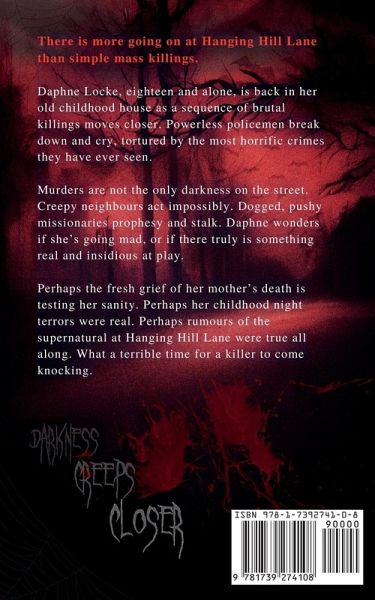 A horror novella. There is more going on at Hanging Hill Lane than simple mass killings. Daphne Locke, eighteen and alone, is back in her old childhood house as a sequence of brutal killings moves closer. Powerless policemen break down and cry, tortured by the most horrific crimes they have ever seen. Murders are not the only darkness on the street. Creepy neighbours act impossibly. Dogged, pushy missionaries prophesy and stalk. Daphne wonders if she's going mad, or if there truly is something real and insidious at play. Perhaps the grief of her mother's recent death is testing her sanity. Perhaps her childhood night terrors were real. Perhaps rumours of the supernatural at Hanging Hill Lane were true all along. What a terrible time for a killer to come knocking. The House on Hanging Hill Lane is a dark tale of a lone and terrified teenager as murder, madness, and terrors from another world move in.