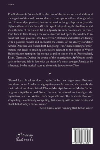 Rosalindenstraße 36 was built at the turn of the last century and withstood the vagaries of time and two world wars. Its occupants suffered through inflation of unheard proportions, times of depression, hunger, deprivation, and the highs and lows of their lives. Were it capable of speaking, the dwelling would share the tales of the rise and fall of a dynasty. An eerie dream takes the reader from floor to floor through the entire structure and opens the window to an event that takes place in 1996. Detectives Apfelbaum and Sattler are dealing with a possible murder and encounter the charms of the elderly storyteller Amalia Dorothea von Eichendorff-Dingdong. It is Amalia's sharing of information that leads to amazing conclusions relevant to the corpse of Walter Hahnenkamm resting in the morgue at police station #41 in Rüttenscheid, Essen, Germany. During the course of the investigation, Apfelbaum travels back in time and falls in love with the vision of a much younger Amalia as he is haunted by the musical score to the movie Somewhere in Time.