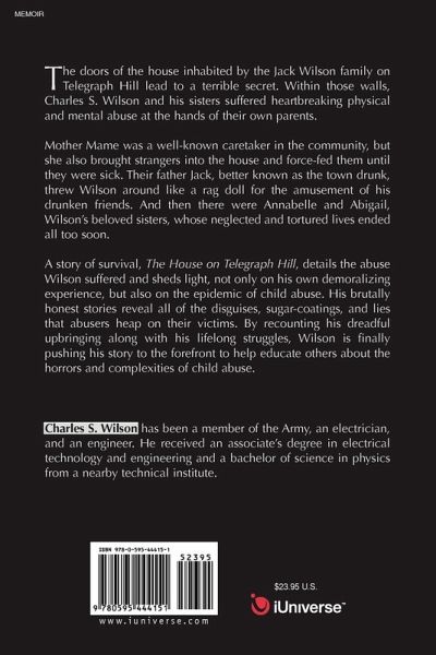 The doors of the house inhabited by the Jack Wilson family on Telegraph Hill lead to a terrible secret. Within those walls, Charles S. Wilson and his sisters suffered heartbreaking physical and mental abuse at the hands of their own parents. Mother Mame was a well-known caretaker in the community, but she also brought strangers into the house and force-fed them until they were sick. Their father Jack, better known as the town drunk, threw Wilson around like a rag doll for the amusement of his drunken friends. And then there were Annabelle and Abigail, Wilson's beloved sisters, whose neglected and tortured lives ended all too soon. A story of survival, The House on Telegraph Hill, details the abuse Wilson suffered and sheds light, not only on his own demoralizing experience, but also on the epidemic of child abuse. His brutally honest stories reveal all of the disguises, sugar-coatings, and lies that abusers heap on their victims. By recounting his dreadful upbringing along with his lifelong struggles, Wilson is finally pushing his story to the forefront to help educate others about the horrors and complexities of child abuse.