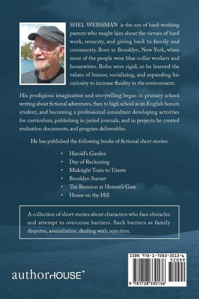 SHEL WEISSMAN is the son of hard-working parents who taught him about the virtues of hard work, tenacity, and giving back to family and community. Born in Brooklyn, New York, when most of the people were blue-collar workers and housewives. Roles were rigid, so he learned the values of humor, socializing, and expanding his curiosity to increase fluidity in the environment. His prodigious imagination and storytelling began in primary school writing about fictional adventures, then to high school as an English honors student, and becoming a professional consultant developing activities for curriculum, publishing in juried journals, and in projects he created evaluation documents, and program deliverables. He has published the following books of fictional short stories: - Harold's Garden - Day of Reckoning - Midnight Train to Trieste - Brooklyn Sunset - The Reunion at Heaven's Gate - House on the Hill