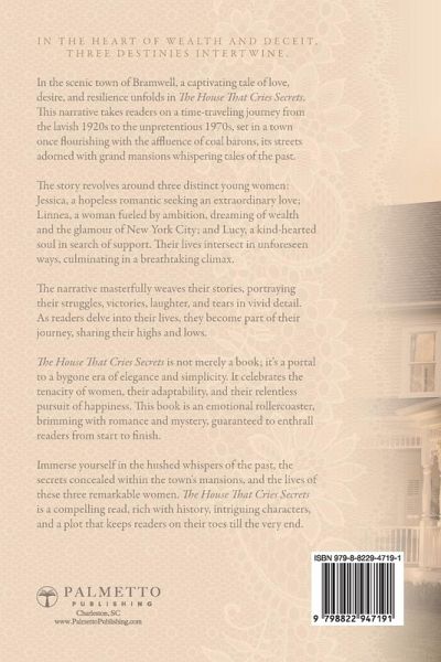 Unravel the Secrets of Love, Wealth, and Survival in a Historic Coal Town: A Tale of Three Women's Lives Intertwined in the Roaring Twenties and Beyond. In the heart of the picturesque town of Bramwell, nestled on the peninsula of the Bluestone River, lies a story of love, ambition, and survival. The House That Cries Secrets takes you on a riveting journey through time, from the opulence of the 1920s to the simplicity of the 1970s. This tale is set against the backdrop of a town that once thrived on the wealth of coal barons, its streets lined with magnificent mansions, each holding a piece of history within its walls. We follow the lives of three young women, each with their unique dreams and aspirations. Jessica, a hopeless romantic, yearns for a love that transcends the ordinary. Linnea, driven by ambition, dreams of wealth and the allure of New York City. Lucy, a gentle soul, seeks someone to lend her a helping hand. Their paths cross in unexpected ways, leading to a climax that will leave you breathless. The narrative beautifully intertwines their stories, painting a vivid picture of their struggles, triumphs, laughter, and tears. As you delve deeper into their lives, you will find yourself immersed in their journey, experiencing their joys and sorrows as if they were your own. The House That Cries Secrets is more than just a book; it's a time machine that transports you back to an era of grandeur and simplicity. It's a testament to the resilience of women, their ability to adapt, and their unwavering pursuit of happiness. This book is a rollercoaster of emotions, filled with romance and mystery, that will captivate you from the first page to the last. Experience the whispers of the past, the secrets hidden within the town's mansions, and the lives of three extraordinary women in The House That Cries Secrets. This book is a must-read for anyone who loves a good story, filled with rich history, compelling characters, and a plot that keeps you guessing until the very end.