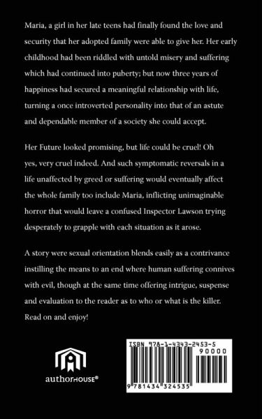 Maria, a girl in her late teens had finally found the love and security that her adopted family were able to give her. Her early childhood had been riddled with untold misery and suffering which had continued into puberty; but now three years of happiness had secured a meaningful relationship with life, turning a once introverted personality into that of an astute and dependable member of a society she could accept. Her Future looked promising, but life could be cruel! Oh yes, very cruel indeed. And such symptomatic reversals in a life unaffected by greed or suffering would eventually affect the whole family too include Maria, inflicting unimaginable horror that would leave a confused Inspector Lawson trying desperately to grapple with each situation as it arose. A story were sexual orientation blends easily as a contrivance instilling the means to an end where human suffering connives with evil, though at the same time offering intrigue, suspense and evaluation to the reader as to who or what is the killer. Read on and enjoy!
