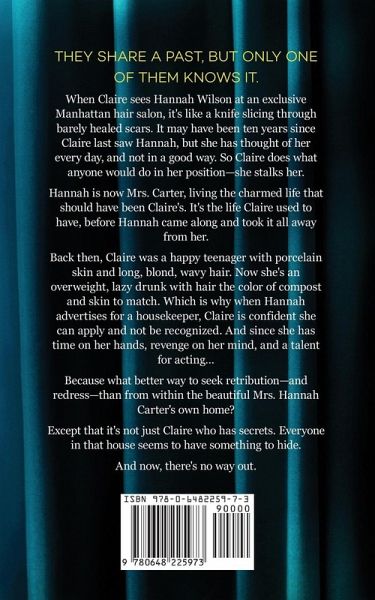 She's a liar. She's a stalker. She's in your house. When Claire sees Hannah Wilson at an exclusive Manhattan hair salon, it's like a knife slicing through barely healed scars. It may have been ten years since Claire last saw Hannah, but she has thought of her every day, and not in a good way. So Claire does what anyone would do in her position-she stalks her. Hannah is now Mrs. Carter, living the charmed life that should have been Claire's. It's the life Claire used to have, before Hannah came along and took it all away from her. Back then, Claire was a happy teenager with porcelain skin and long, wavy blond hair. Now she's an overweight, lazy drunk with hair the color of compost and skin to match. Which is why when Hannah advertises for a housekeeper, Claire is confident she can apply and not be recognized. And since she has time on her hands, revenge on her mind, and a talent for acting… Because what better way to seek retribution-and redress-than from within the beautiful Mrs. Hannah Carter's own home? Except that it's not just Claire who has secrets. Everyone in that house seems to have something to hide. And now, there's no way out.