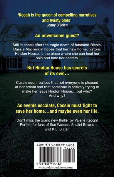 The brilliant new psychological thriller from bestselling author, Valerie Keogh! 'Keogh is the queen of compelling narratives and twisty plots' Jenny O'Brien 'A wonderful book, I can't rate this one highly enough. If only there were ten stars, it's that good. Valerie Keogh is a master story-teller, and this is a masterful performance.' Bestselling author Anita Waller An unwelcome guest? Still in shock after the tragic death of husband Richie, Cassie Macreddin hopes that her new home, historic Hindon House, is the place where she can heal her pain and hide her secrets. But Hindon House has secrets of its own... Cassie soon realises that not everyone is pleased at her arrival and that someone is actively trying to make her leave Hindon House....but who? And why? As events escalate, Cassie must fight to save her home...and maybe even her life. Don't miss the brand new thriller by Valerie Keogh! Perfect for fans of Sue Watson, Shalini Boland and K.L. Slater.