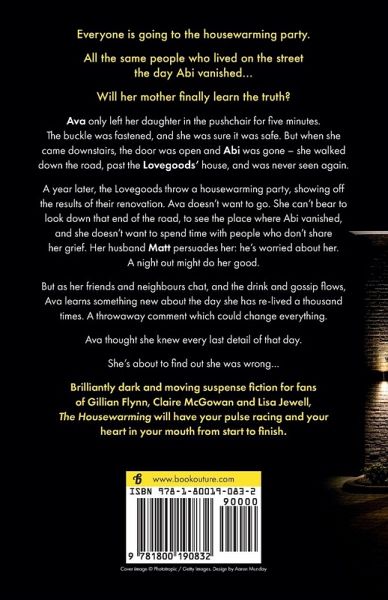 Everyone is going to the housewarming party. All the same people who lived on the street the day Abi vanished... Will her mother finally learn the truth? Ava only left her daughter in the pushchair for five minutes. The buckle was fastened, and she was sure it was safe. But when she came downstairs, the door was open and Abi was gone - she walked down the road, past the Lovegoods' house, and was never seen again. A year later, the Lovegoods are planning their long-anticipated housewarming party. Ava doesn't want to go. She can't bear to look down that end of the road, to see the place where Abi vanished, and she doesn't want to spend time with people who don't share her grief. Her husband Matt persuades her: he's worried about her. A night out might do her good. But as her friends and neighbours chat, and the drink and gossip flows, Ava learns something new about the day she has re-lived a thousand times. A throwaway comment which could change everything. Ava thought she knew every last detail of that day. She's about to find out she was wrong... Brilliantly dark and moving suspense fiction for fans of Gillian Flynn, Claire McGowan and Lisa Jewell, The Housewarming will have your pulse racing and your heart in your mouth from start to finish. See what readers are saying about The Housewarming: 'My stomach is in knots!... Great writing, fantastic characters and a compelling and thought-provoking plot... The tension doesn't let up for a second. If I'd had the time to read it in one sitting, I wouldn't have put it down until the last word.' Motherhood for Slackers, ¿¿¿¿¿ 'Fast paced all the way through... Keeps the reader hooked from one page to the next. Definitely not one to be missed!' NetGalley Reviewer, ¿¿¿¿¿