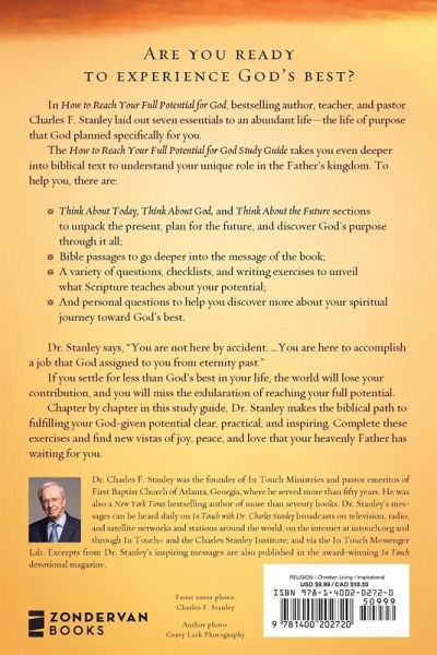 Are you ready to experience God's best? In How to Reach Your Full Potential for God, best-selling author, teacher, and pastor Charles F. Stanley laid out seven essentials to an abundant life?the life of purpose that God planned specifically for you. The How to Reach Your Full Potential for God Study Guide, takes you even deeper into biblical text to understand your unique role in the Father's kingdom. To help you, there are: Think About Today, Think About God, and Think About the Future sections to unpack the present, plan for the future, and discover God's purpose through it all; Bible passages to go deeper into the message of the book; A variety of questions, checklists, and writing exercises to unveil what Scripture teaches about your potential; And personal questions to help you discover more about your spiritual journey toward God's best. Dr. Stanley says, "You are not here by accident. . . . You are here to accommplish a job that God assigned to you from eternity past." If you settle for less than God's best in your life, the world will lose your contribution, and you will miss the exhilaration of reaching your full potential. Chapter by chapter in this study guide, Dr. Stanley makes the biblical path to fulfilling your God-given potential clear, practical, and inspiring. Complete these exercises and find new vistas of joy, peace, and love that your heavenly Father has waiting for you.