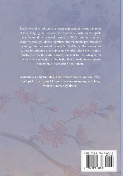 About the book: The Howls of Wind paints a poetic exploration through themes of love, longing, nature, and self-discovery. Each poem depicts the ephemeral yet eternal beauty of life's moments, where shadows and light dance together, and where the past breathes meaning into the present. Windy Situ's debut collection invites readers to immerse themselves in a world where the ordinary transforms into the extraordinary, carried by the whispers of the wind - a reflection of the belief that to truly love someone is to embrace everything about them. "The Howls of Wind" is a lyrical symphony of love, loss, and self-discovery, penned by Windy Situ. Each poem carries the whispers of a restless soul-chasing memories, confronting shadows, and finding beauty in the quiet spaces of the heart. This collection breathes life into fleeting moments: the tenderness of first love, the ache of distant horizons, and the solace found in nature's gentle embrace. Through vivid imagery and intimate reflection, Windy's words invite readers to linger in the echoes of their own dreams and desires. For those who have loved, for those who have lost, and for those still seeking, "The Howls of Wind" is a companion for the journey-a place where emotions unfurl and hearts find their voice.