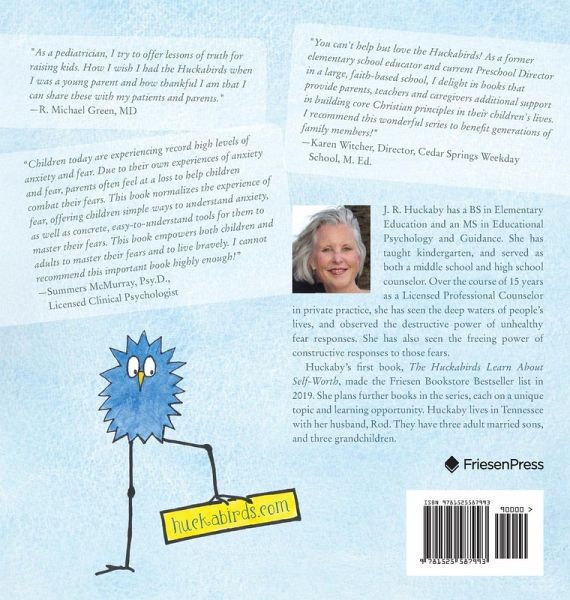 The Huckabirds Learn to Face Their Fears is a 3-in-1 book. It starts with two illustrated children's stories paired with a back section for parents and caregivers. The back section offers an abundance of practical wisdom, skills and help in growing children who choose courage over fear. It all begins on a hot summer day, with an outing to the bird bath. Liam, the youngest Huckabird, has never been to a bird bath before! Fear causes him to miss out on the family fun. How will he ever learn to overcome his fear? Children will get to learn along with Liam! In the second story, the birds Lucy, Ryan, and Claire learn they each have a personal fear that they want to overcome. As these three Huckabird friends help each other face their fears, young readers gain understanding and learn the skills they need to challenge their own fears. Learning how to deal with fear is life changing. The combination of these two whimsical stories with a section full of practical help, trusted skills, model conversations, and encouragement will go a long way to help grow healthy children and eliminate crippling fear.