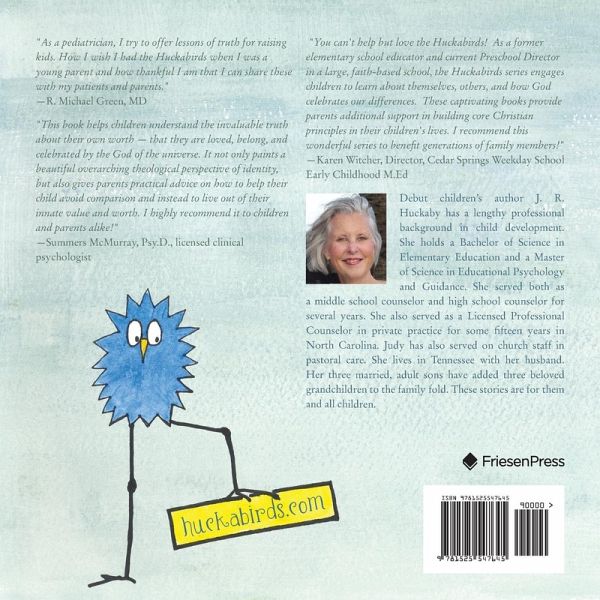 This book is 3-in-1. It includes two full illustrated children's stories and a chapter for adults. The combination of two stories and the help for adults together give common language, images, discussion questions, and practical application for understanding this crucial topic. Most people in the fields of child development, social work, and psychology agree that a pivotal factor in what occurs both inside and between people is the picture of self-worth that each person carries inside. This book is intended for young children and the significant adults in their lives: parents, grandparents, teachers, care-givers, and therapists. Children will find the artsy, playful Huckabirds appealing and will relate to their real life experiences. Adults desiring to give children a Christian perspective and to be intentional in raising healthy, whole-hearted children will be helped and encouraged by the teaching chapter in the back.