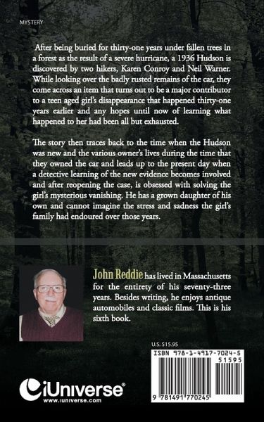 After being buried for thirty-one years under fallen trees in a forest as the result of a severe hurricane, a 1936 Hudson is discovered by two hikers, Karen Conroy and Neil Warner. While looking over the badly rusted remains of the car, they come across an item that turns out to be a major contributor to a teen aged girl's disappearance that happened thirty-one years earlier and any hopes until now of learning what happened to her had been all but exhausted. The story then traces back to the time when the Hudson was new and the various owner's lives during the time that they owned the car and leads up to the present day when a detective learning of the new evidence becomes involved and after reopening the case, is obsessed with solving the girl's mysterious vanishing. He has a grown daughter of his own and cannot imagine the stress and sadness the girl's family had endoured over those years.