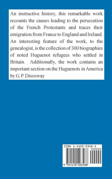 An instructive history, this remarkable work recounts the causes leading to the persecution of the French Protestants and traces their emigration from France to England and Ireland. An interesting feature of the work, to the genealogist, is the collection of 300 biographies of noted Huguenot refugees who settled in Britain. Additionally, the work contains an important section on the Huguenots in America by G. P. Disoway