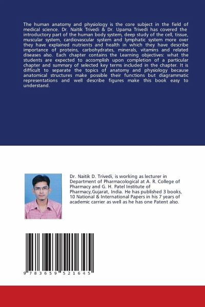 The human anatomy and physiology is the core subject in the field of medical science. Dr. Naitik Trivedi & Dr. Upama Trivedi has covered the introductory part of the human body system, deep study of the cell, tissue, muscular system, cardiovascular system and lymphatic system more over they have explained nutrients and health in which they have describe importance of proteins, carbohydrates, minerals, vitamins and related diseases also. Each chapter contains the Learning objectives: what the students are expected to accomplish upon completion of a particular chapter and summary of selected key terms included in the chapter. It is difficult to separate the topics of anatomy and physiology because anatomical structures make possible their functions but diagrammatic representations and well describe figures make this book easy to understand.