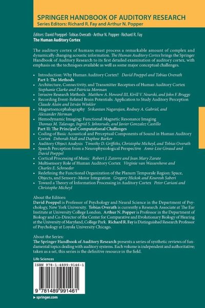 "This book describes the auditory cortex of humans as related to auditory processing and explores the various techniques available to study auditory processing. ... It is intended for advanced graduate students, postdoctoral researchers, and clinical investigators with an interest in hearing research. ... This is a very good handbook on the auditory cortex, covering the topic well from methodology through elementary challenges in auditory processing. ... for those with a basic background in audition, it will add greatly to their knowledge base." (Gary B. Kaniuk, Doody's Review Service, October, 2012)