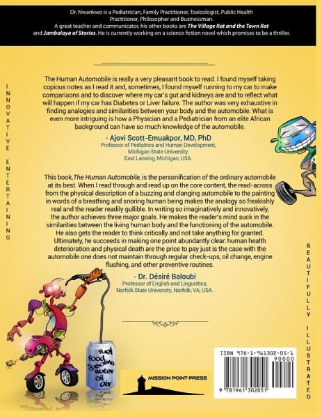 Uncanny and apt comparisons of humans to automobiles. Comparisons used to educate readers on the importance of maintaining your body as you maintain your automobile. How often do we rush to the automobile mechanic when we hear a noise in our automobile but neglect to see our physician when our bodies give us warning signs? Hopefully after reading this book, you will care for your body as you would care for your automobile. Whilst parts or entire automobiles are replaceable, despite advances in transplantation, human parts are still hard to replace. Therefore, take good care of your body to enjoy your automobile as you may expire before your automobile. If you find The Human Automobile educative and informative, please share the joy and enlightenment. Your "health" shall thank you for it. Happy reading!