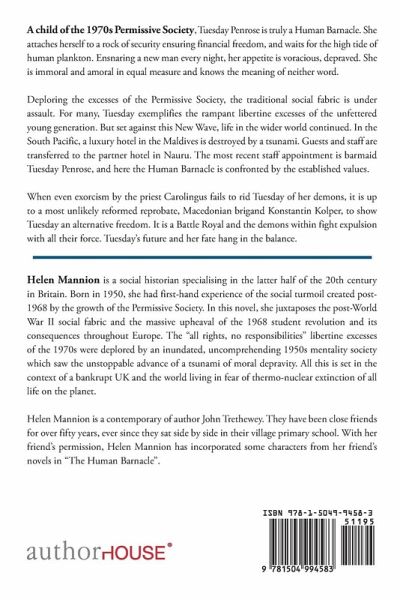 A child of the 1970s Permissive Society, Tuesday Penrose is truly a Human Barnacle. She attaches herself to a rock of security ensuring financial freedom, and waits for the high tide of human plankton. Ensnaring a new man every night, her appetite is voracious, depraved. She is immoral and amoral in equal measure and knows the meaning of neither word. Deploring the excesses of the Permissive Society, the traditional social fabric is under assault. For many, Tuesday exemplifies the rampant libertine excesses of the unfettered young generation. But set against this New Wave, life in the wider world continued. In the South Pacific, a luxury hotel in the Maldives is destroyed by a tsunami. Guests and staff are transferred to the partner hotel in Nauru. The most recent staff appointment is barmaid Tuesday Penrose, and here the Human Barnacle is confronted by the established values. When even exorcism by the priest Carolingus fails to rid Tuesday of her demons, it is up to a most unlikely reformed reprobate, Macedonian brigand Konstantin Kolper, to show Tuesday an alternative freedom. It is a Battle Royal and the demons within fight expulsion with all their force. Tuesday's future and her fate hang in the balance.
