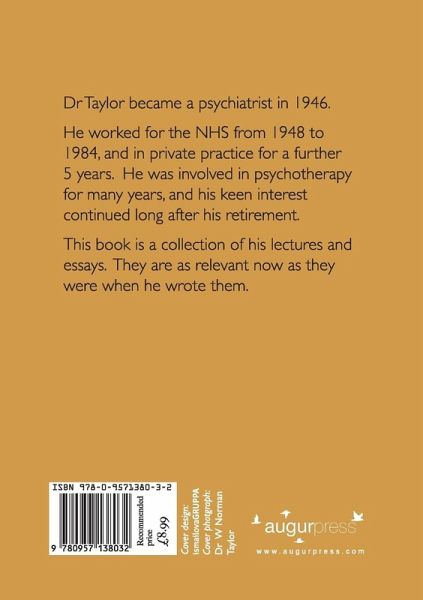 This collection of Dr Taylor's lectures and essays have been selected from writings that span 50 years. The lectures are dated from 1975 to 1982, whereas the essays are dated 1956, 2004 & 2005. From the lectures any reader will see how closely psychiatry, psychology, psychotherapy and psychoanalysis are interlinked, and how the relatively modern profession of counselling can play an important part in the development of human potential. The essays comprise reflections on disturbance in society from two different eras, together with one on the fundamental requirements of training for counsellors.