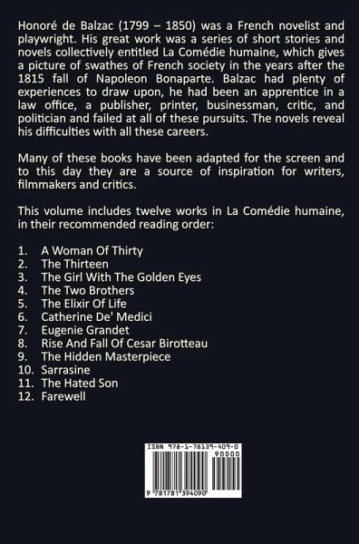 Honoré de Balzac (1799 - 1850) was a French novelist and playwright. His great work was a series of short stories and novels collectively entitled La Comédie Humaine, which gives a picture of swathes of French society in the years after the 1815 fall of Napoleon Bonaparte. Balzac had plenty of experiences to draw upon, he had been an apprentice in a law office, a publisher, printer, businessman, critic, and politician and failed at all of these pursuits. The novels reveal his difficulties with all these careers. Many of these books have been adapted for the screen and to this day they are a source of inspiration for writers, filmmakers and critics. This volume includes twelve works in La Comédie Humaine, in their recommended reading order: A Woman Of Thirty, The Thirteen, The Girl With The Golden Eyes, The Two Brothers, The Elixir Of Life, Catherine De' Medici, Eugenie Grandet, Rise And Fall Of Cesar Birotteau, The Hidden Masterpiece, Sarrasine, The Hated Son, Farewell