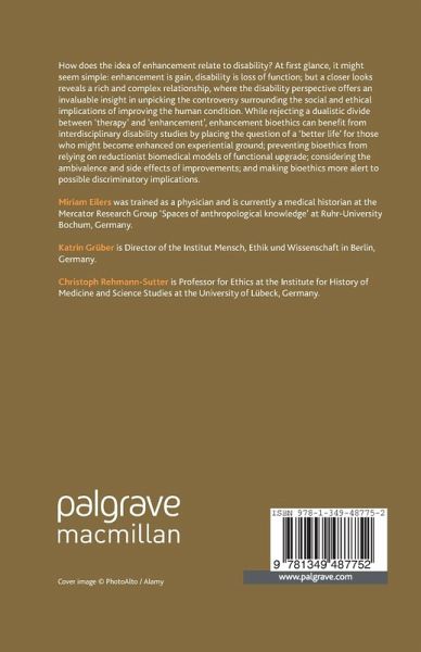 Preface; Tom Shakespeare 1. Looking at Human Enhancement through the Disability Lens; Christoph Rehmann-Sutter, Miriam Eilers and Katrin Grübe PART I: NORMS AND BODY 2. On Unfamiliar Moral Territory: About Variant Embodiment, Enhancement and Normativity; Jackie Leach Scully 3. Improving Deficiencies? Historical, Anthropological, and Ethical Aspects of the Human Condition; Christina Schües PART II: CASE STUDIES 4. Good Old Brains: How Concerns about the Ageing Society and Ideas about Cognitive Enhancement Interact in Neuroscience; Morten Bülow 5. The Making and Unmaking of Deaf Children; Sigrid Bosteels and Stuart Blume 6. Token of the Loss: Ethnography of Artificial Restoration of Cancer Patients' Bodies and Lives in Kenya; Benson Mulemi 7. Singing Better by Sacrificing Sex; Anna Piotrowska PART III. UTOPIAN IDEAS AND REAL EMBODIMENT 8. Mood Enhancement and the Authenticity of Experience: Ethical Considerations; Lisa Forsberg 9. Prometheus Descends - Disabled or Enhanced?: John Harris,Human Enhancement, and the Creation of a New Norm; Trijsje Franssen 10. More Human than Human!: How Recent Hollywood Films Depict Enhancement Technologies - and Why; Kathrin Klohs 11. Transhumanism's Anthropological Assumptions: A Critique; Nicolai Münch 12. Be Afraid of the Unmodified Body! The Social Construction of Risk in Enhancement Utopianism; Sascha Dickel