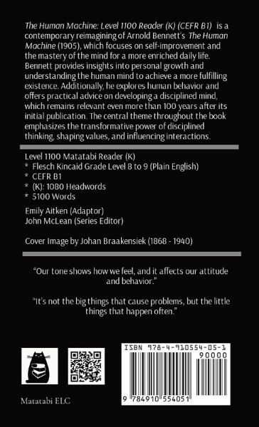 The Human Machine: Level 1100 Reader (K) (CEFR B1) is a contemporary reimagining of Arnold Bennett's The Human Machine (1905), which focuses on self-improvement and the mastery of the mind for a more enriched daily life. Bennett provides insights into personal growth and understanding the human mind to achieve a more fulfilling existence. Additionally, he explores human behavior and offers practical advice on developing a disciplined mind, which remains relevant even more than 100 years after its initial publication. The central theme throughout the book emphasizes the transformative power of disciplined thinking, shaping values, and influencing interactions. ¿¿¿¿¿¿¿¿¿¿¿¿¿¿¿¿¿Level 1100 Matatabi Reader (K) * Flesch Kincaid Grade Level 8 to 9 (Plain English) * CEFR B1 * (K): 1080 Headwords * 5100 Words