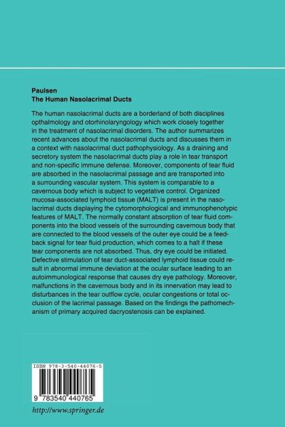 The human nasolacrimal ducts are a borderland of both disciplines opthalmology and otorhinolaryngology which work closely together in the tretament of nasolacrimal disorders. The author summarizes recent advances about the nasolacrimal ducts and discusses them in a context with nasolacrimal duct pathophysiology. As a draining and secretory system the nasolacrimal ducts play a role in tear transport and non-specific immune defense. Moreover, components of tear fluid are absorbed in the nasolacrimal passage and are transported into a surrounding vascular system. This system is comparable to a cavernous body which is subject to vegetative control. Organized mucosa-associated lymphoid tissue (MALT) is present in the nasolacrimal ducts displaying the cytomorphological and immunophenotypic features of MALT. The normally constant absorption of tear fluid components into the blood vessels of the surrounding cavernous body that are connected to the blood vessels of the outer eye could be a feedback signal for tear fluid production, which comes to a halt if these tear components are not absorbed. Thus, dry eye could be initiated. Defective stimulation of tear duct-associated lymphoid tissue could result in abnormal immune deviation at the ocular surface leading to an autoimmunological response that causes dry eye pathology. Moreover, malfunctions in the cavernous body and in its innervation may lead to disturbances in the tear outflow cycle, ocular congestions or total occlusion of the lacrimal passage. Based on the findings the pathomechanism of primary acquired dacryostenosis can be explained.