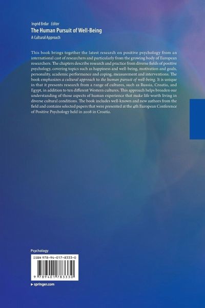 Preface: Ingrid Brdar.- Introduction: The Human Pursuit of Well-Being: A Cultural approach, Ingrid Brdar.- Part 1. Happiness and Well-being: 1. Can we get Happier than we are?: Ruut Veenhoven.-2. Self-serving Attributional Bias and Hedonic and Eudaimonic Aspects of Well-being: Pilar Sanjuán, Alejandro Magallares and Rodolfo Gordillo.-3. Affect Specificity as Indicators of National Well-Being, Representative Sample of Croatia: Ljiljana Kaliterna Lipovcan, Zvjezdana Prizmic-Larsen and Tihana Brkljacic.- 4. From Flow to Optimal Experience. (Re)searching the Quality of Subjective Experience Throughout Daily Life: Teresa Freire.-5. Gender Differences in Psychological Well-being and Distress during Adolescence: Dalila Visani Elisa Albieri, Emanuela Offidani, Fedra Ottolini, Elena Tomba, Chiara Ruini.-6. The Impact of Positive Affect: Two weekly Assessment Studies on Benefits of Positive Emotions in Patients with a Chronic Painful Disease: Elin Strand.-7. Studying Predictors of Post-traumatic Growth in Cancer Patients: Marta Scrignaro, Sandro Barni, Maria Luisa Bonetti and Maria Elena Magrin.-Part 2. Motivation and Goals: 8. It's all about me: Maladaptive self-focused attention as a mediator of the relationship between extrinsic goals and well-being: Mami Yamaguchi and Jamin Halberstadt.-9. The Relation of Intrinsic and Extrinsic Aspirations to Adolescent Life Satisfaction: Marina Merkas, Zora Raboteg-Saric and Dubravka Miljkovic.-10. Where does the motivation for the antiretroviral therapy come from?: Assessing existential meaning, personal growth and motivation towards antiretroviral therapy in people affected by HIV/AIDS: Krzysztof Szadejko and Gabriele Covotta.-Part 3. Personality: 11. The Relationships between temperament, character strengths and resilience: Ann-Marie K. Hutchinson, Anita D. Stuart and Hester G. Pretorius.-12. Character Strengths and Well-being: Are there gender differences?: Ingrid Brdar, PetraAnic and Majda Rijavec.-Part 4. Academic performance and coping: 13. Optimistic attributional style as a predictor of well-being and performance in different academic settings: A new look at the problem: Tamara O. Gordeeva and Evgeny N. Osin.-14. To flourish, arm or fade away?: Proactive, defensive and depressive patterns of self-regulated learning: Darko Loncaric.-15. Moderator effect of burnout in secondary school context: Charles Martin-Krumm, Marie Oger, Philippe Sarrazin and Patrick Pelayo.-Part 5. Measurement: 16. Factor Structure of the French Ryff's Psychological Well-Being Scales for Active Older Adults: Mareï Salama-Younes, Amany Ismaïl, Ali Montazeri and Charles Roncin.-17. Further Evaluation of the Test-retest Reliability of the Children Hope Scale and Students' Life Satisfaction Scale: Susana C. Marques, Jose L. Pais Ribeiro and Shane J. Lopez.-18. Validation of the Mental Health Continuum Short Form and Subjective Vitality Scale with Egyptian Adolescent Athletes: Mareï Salama-Younes.-Part 6. Interventions:19. School interventions for promoting psychological well-being in adolescence: Chiara Ruini, Fedra Ottolini, Elena Tomba, Carlotta Belaise, Elisa Albieri, Dalila Visani, Ernesto Caffo and Giovanni A. Fava.-20. Applying Self-Determination Theory to Help Obese Portuguese Individuals: Sónia Mestre and Jose L. Pais Ribeiro.-21. A School-based Intervention Involving Massage and Yoga for Male Disadvantaged Adolescents: An Exploratory Study on a Self Discovery Programme: Lesley Powell.