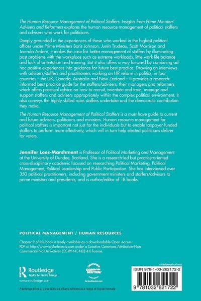 Deeply grounded in the experiences of those who worked in the highest political offices under Prime Ministers Boris Johnson, Justin Trudeau, Scott Morrison and Jacinda Ardern, it makes the case for better management of staffers by illuminating past problems with the workplace such as extreme workloads, little work-life balance and lack of orientation and training. But it also offers a way forward by combining ad hoc positive experiences into guidance for future best practice. Drawing on interviews with advisers/staffers and practitioners working on HR reform in politics, in four countries - the UK, Canada, Australia and New Zealand - it provides a research-informed best practice guide for the staffers/advisers, their managers and reformers which offers practical advice on how to recruit, orientate and train, manage and support staffers and advisers appropriately within the complex political environment. It also conveys the highly skilled roles staffers undertake and the democratic contribution they make.