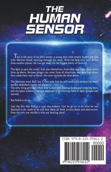 A Y.A. sci-fi paranormal adventure book. In "The Human Sensor Book 1", readers will be taken on a thrilling Y.A. sci-fi paranormal adventure as they follow Ralf's journey. At only eight years old, type one diabetic Ralf was bitten by a beast from another world, leaving him with severe problems. However, a brave Martian stepped in to save him, guide him, teach him, and gave him new powers and an eternal friendship. He could now sense aliens, conjure with only his bare hands, and use multiple unearthly weapons that no one else could. As space cadet Ralf gets older and tries to enter space, he must watch out for the Martians who are hunting him down for sport. Along the way, he meets a handsome wolf shifter and a fun-loving alien who help him face the danger that is coming down to Earth from the sky above. This action-packed novel contains aliens, wolf shifters, and general fighting - plus, mild cursing. Recommended for readers 12 and up, "The Human Sensor Book 1" will leave readers begging for more of Ralf's adventures.