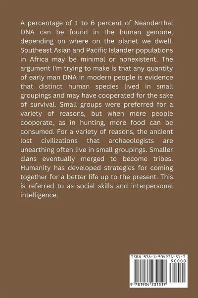 A percentage of 1 to 6 percent of Neanderthal DNA can be found in the human genome, depending on where on the planet we dwell. Southeast Asian and Pacific Islander populations in Africa may be minimal or nonexistent. The argument I'm trying to make is that any quantity of early man DNA in modern people is evidence that distinct human species lived in small groupings and may have cooperated for the sake of survival. Small groups were preferred for a variety of reasons, but when more people cooperate, as in hunting, more food can be consumed. For a variety of reasons, the ancient lost civilizations that archaeologists are unearthing often live in small groupings. Smaller clans eventually merged to become tribes. Humanity has developed strategies for coming together for a better life up to the present. This is referred to as social skills and interpersonal intelligence.