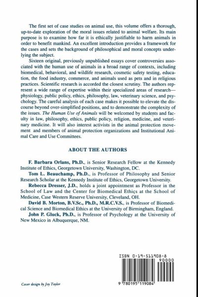 F. Barbara Orlans, Ph.D., is Senior Research Fellow at the Kennedy Institute of Ethics, Georgetown University, Washington, D.C. Tom L. Beauchamp, Ph.D., is Professor of Philosophy and Senior Research Scholar at the Kennedy Institute of Ethics, Georgetown University. Rebecca Dresser, J.D., holds a joint appointment as Professor in the School of Law and the Center for Biomedical Ethics at the School of Medicine, Case Western Reserve University, Cleveland, OH. David B. Morton, B.V.Sc., Ph.D., M.R.C.V.S., is Professor of Biomedical Science and Biomedical Ethics at the University of Birmingham, England. John P. Gluck, Ph.D., is Professor of Psychology at the University of New Mexico in Albuquerque, NM.