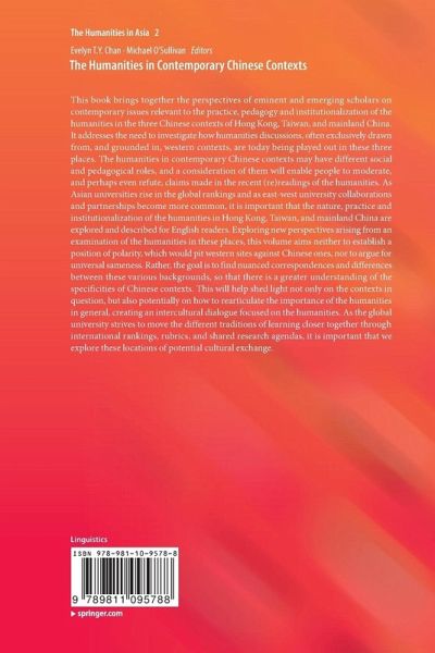 This book brings together the perspectives of eminent and emerging scholars on contemporary issues relevant to the practice, pedagogy and institutionalization of the humanities in the three Chinese contexts of Hong Kong, Taiwan, and mainland China. It addresses the need to investigate how humanities discussions, often exclusively drawn from, and grounded in, western contexts, are today being played out in these three places. The humanities in contemporary Chinese contexts may have different social and pedagogical roles, and a consideration of them will enable people to moderate, and perhaps even refute, claims made in the recent (re)readings of the humanities. As Asian universities rise in the global rankings and as east-west university collaborations and partnerships become more common, it is important that the nature, practice and institutionalization of the humanities in Hong Kong, Taiwan, and mainland China are explored and described for English readers. Exploring new perspectivesarising from an examination of the humanities in these places, this volume aims neither to establish a position of polarity, which would pit western sites against Chinese ones, nor to argue for universal sameness. Rather, the goal is to find nuanced correspondences and differences between these various backgrounds, so that there is a greater understanding of the specificities of Chinese contexts. This will help shed light not only on the contexts in question, but also potentially on how to rearticulate the importance of the humanities in general, creating an intercultural dialogue focused on the humanities. As the global university strives to move the different traditions of learning closer together through international rankings, rubrics, and shared research agendas, it is important that we explore these locations of potential cultural exchange.