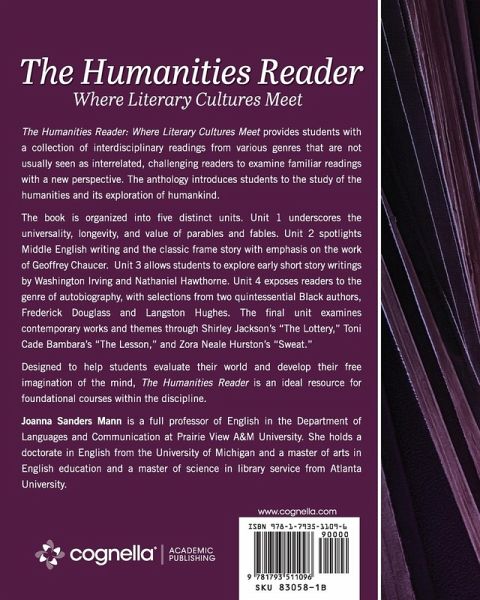 The Humanities Reader: Where Literary Cultures Meet provides students with a collection of interdisciplinary readings from various genres that are not usually seen as interrelated, challenging readers to examine familiar readings with a new perspective. The anthology introduces students to the study of the humanities and its exploration of humankind. The book is organized into five distinct units. Unit 1 underscores the universality, longevity, and value of parables and fables. Unit 2 spotlights Middle English writing and the classic frame story with emphasis on the work of Geoffrey Chaucer. Unit 3 allows students to explore early short story writings by Washington Irving and Nathaniel Hawthorne. Unit 4 exposes readers to the genre of autobiography, with selections from two quintessential Black authors, Frederick Douglass and Langston Hughes. The final unit examines contemporary works and themes through Shirley Jackson's "The Lottery," Toni Cade Bambara's "The Lesson," and Zora Neale Hurston's "Sweat." Designed to help students evaluate their world and develop their free imagination of the mind, The Humanities Reader is an ideal resource for foundational courses within the discipline.