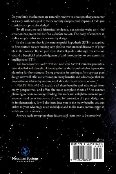 Do you think that humans are naturally reactive to situations they encounter in society, without regard to their enormity and potential impacts? Or do you consider us a proactive design? By all accounts and historical evidence, our species waits until the situation has presented itself to us before we act. The body of evidence in reality supports that we are reactive by design. In the situation that is the extraterrestrial hypothesis (ETH), as applied to first contact, we are moving very close to monumental discovery of other life in the universe. But no plan exists that will guide us through this situation toward a beneficial acknowledgment of and introduction to extraterrestrial intelligences (ETI). The Humaniverse Guide(r): Will ET Talk with Us? will immerse you into a most detailed and thoughtful investigation of the hypothesis that is proactive planning for first contact. Being proactive in starting a first-contact plan design now will offer our civilization many benefits and advantages that are impossible to achieve by waiting until after the contact-event occurs. Will ET Talk with Us? explains all these benefits and advantages from many perspectives, and offers the most complete thesis of first-contact planning in existence today. Reading this work will enlighten, increase your awareness and consciousness to the need for formation of a plan design and its implementation. It will also introduce you to the many benefits you can utilize to your advantage as an individual and to the many communities in which you are a member. Are you ready to explore these futures and learn how to be proactive?